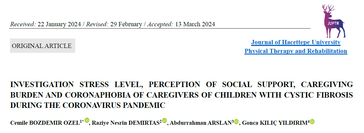 Original ArticlePublished on June 24 2024INVESTIGATION STRESS LEVEL, PERCEPTION OF SOCIAL SUPPORT, CAREGIVING BURDEN AND CORONAPHOBIA OF CAREGIVERS OF CHILDREN WITH CYSTIC FIBROSIS DURING THE CORONAVIRUS PANDEMIC Cemile Bozdemir Özel, Raziye Nesrin Demirtaş, Abdurrahman Arslan, Gonca Kılıç Yıldırım
