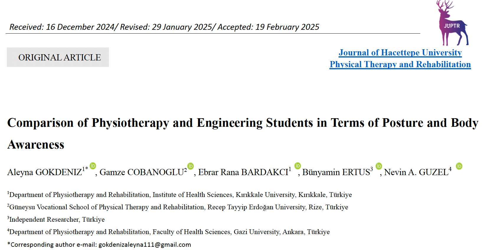 Original ArticlePublished on May 27 2025Comparison of Physiotherapy and Engineering Students in Terms of Posture and Body Awareness Aleyna Gökdeniz, Gamze Çobanoğlu, Ebrar Rana Bardakçı, Bünyamin Ertus, Nevin Aysel Güzel