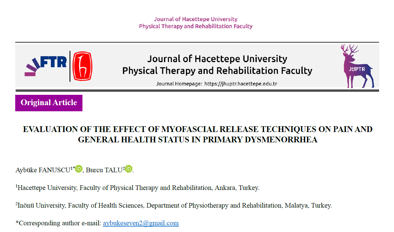 Original ArticlePublished on November 27 2023EVALUATION OF THE EFFECT OF MYOFASCIAL RELEASE TECHNIQUES ON PAIN AND GENERAL HEALTH STATUS IN PRIMARY DYSMENORRHEA Aybüke Fanuscu, Burcu Talu