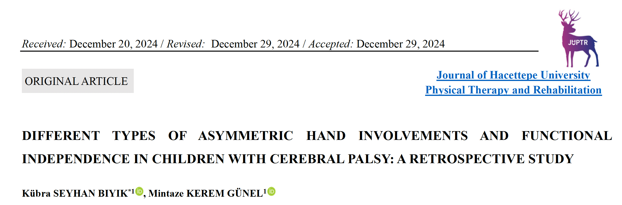 Original ArticlePublished on December 31 2024DIFFERENT TYPES OF ASYMMETRIC HAND INVOLVEMENTS AND FUNCTIONAL INDEPENDENCE IN CHILDREN WITH CEREBRAL PALSY: A RETROSPECTIVE STUDY Kübra Seyhan Bıyık, Mintaze Kerem Günel