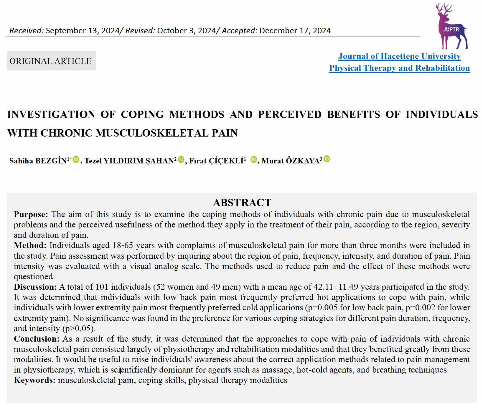 Original ArticlePublished on January 02 2025INVESTIGATION OF COPING METHODS AND PERCEIVED BENEFITS OF INDIVIDUALS WITH CHRONIC MUSCULOSKELETAL PAIN Sabiha Bezgin, Tezel Yıldırım Şahan, Fırat Çiçekli, Murat Özkaya