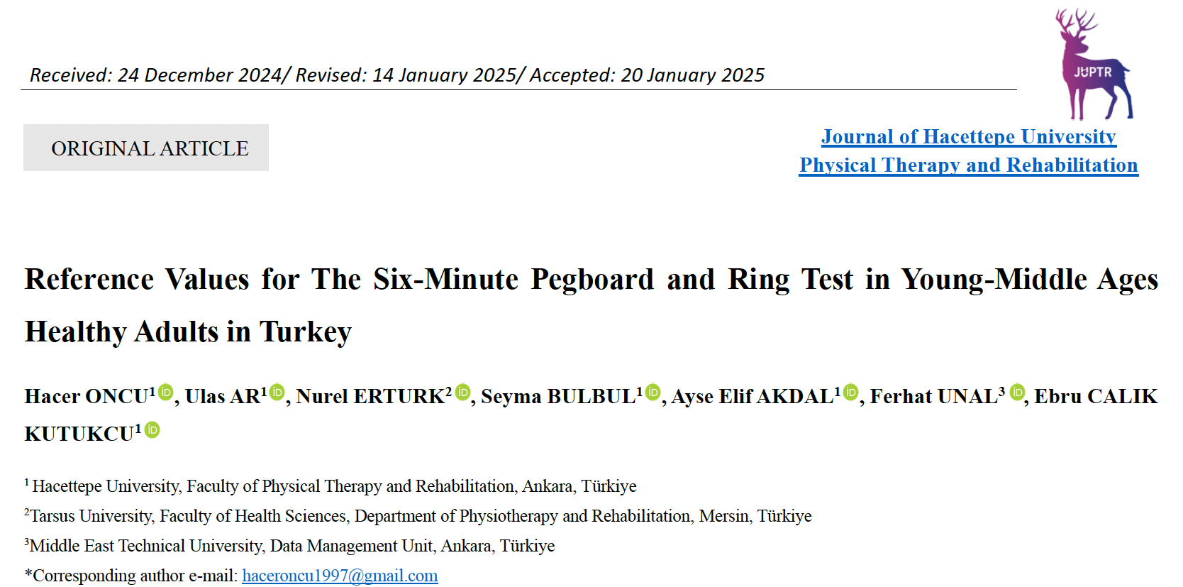 Original ArticlePublished on February 04 2025Reference Values for The Six-Minute Pegboard and Ring Test in Young-Middle Ages Healthy Adults in Turkey Hacer Öncü, Ulaş Ar, Nurel Ertürk, Şeyma Bülbül, Ayşe Elif Akdal, Ferhat Ünal, Ebru Çalık Kütükçü