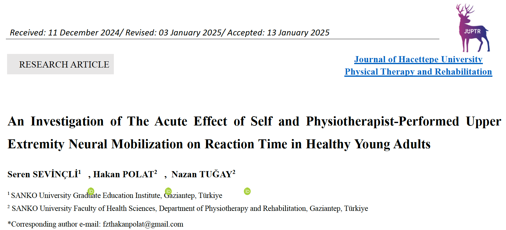 Research ArticlePublished on February 04 2025An Investigation of The Acute Effect of Self and Physiotherapist-Performed Upper Extremity Neural Mobilization on Reaction Time in Healthy Young Adults Seren Sevinçli, Hakan Polat, Nazan Tuğay
