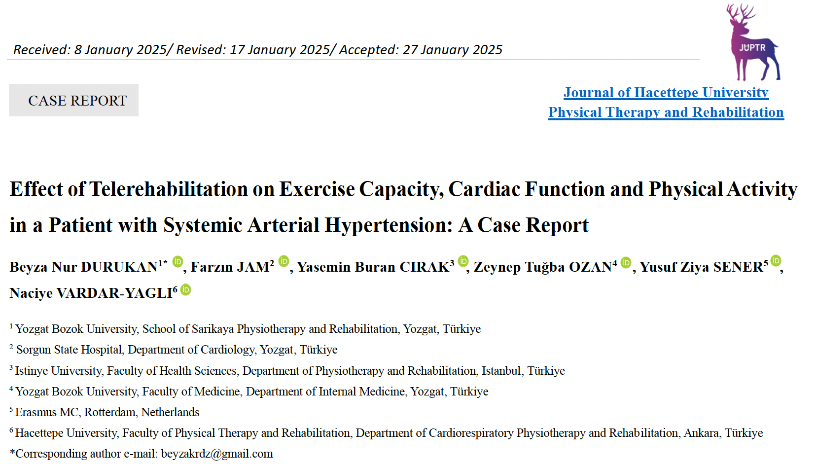 Case ReportPublished on February 04 2025Effect of Telerehabilitation on Exercise Capacity, Cardiac Function and Physical Activity in a Patient with Systemic Arterial Hypertension: A Case Report Beyza Nur Durukan, Farzın Jam, Yasemin Buran Çırak, Zeynep Tuğba Ozan, Yusuf Ziya Şener, Naciye Vardar Yağlı