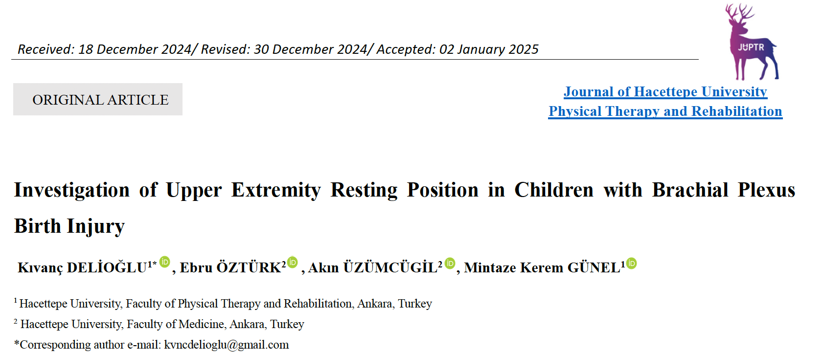 Original ArticlePublished on February 04 2025Investigation of Upper Extremity Resting Position in Children with Brachial Plexus Birth Injury Kıvanç Delioğlu, Ebru Öztürk, Akın Üzümcügil, Mintaze Kerem Günel