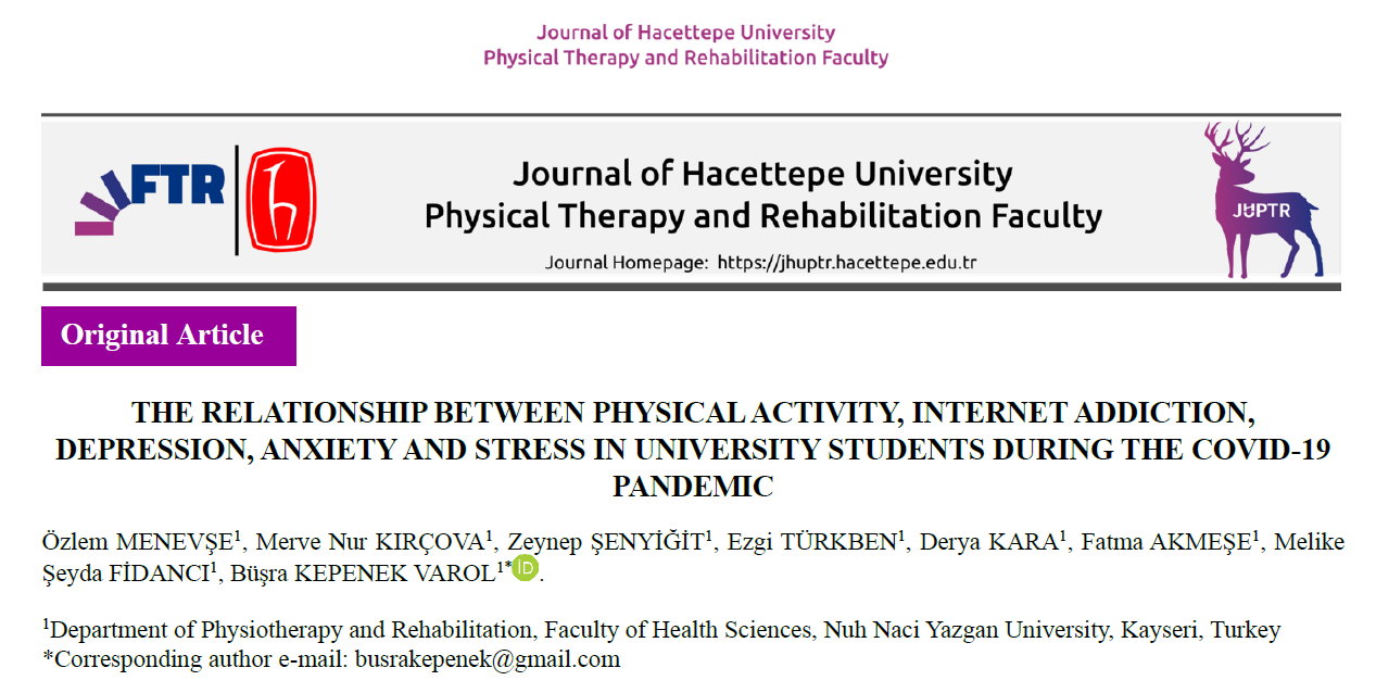 Original ArticlePublished on November 27 2023THE RELATIONSHIP BETWEEN PHYSICAL ACTIVITY, INTERNET ADDICTION, DEPRESSION, ANXIETY AND STRESS IN UNIVERSITY STUDENTS DURING THE COVID-19 PANDEMIC Özlem Menevşe, Merve Nur Kırçova, Zeynep Şenyiğit, Ezgi Türkben, Derya Kara, Fatma Akmeşe, Melike Şeyda Fidancı, Büşra Kepenek Varol