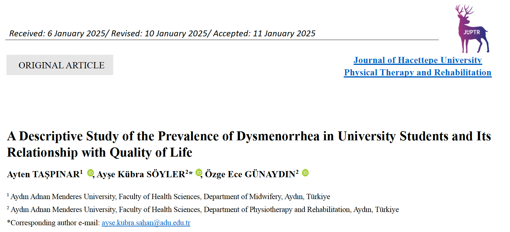 Original ArticlePublished on February 04 2025A Descriptive Study of the Prevalence of Dysmenorrhea in University Students and Its Relationship with Quality of Life Ayten Taşpınar, Ayşe Kübra Söyler, Özge Ece Günaydın