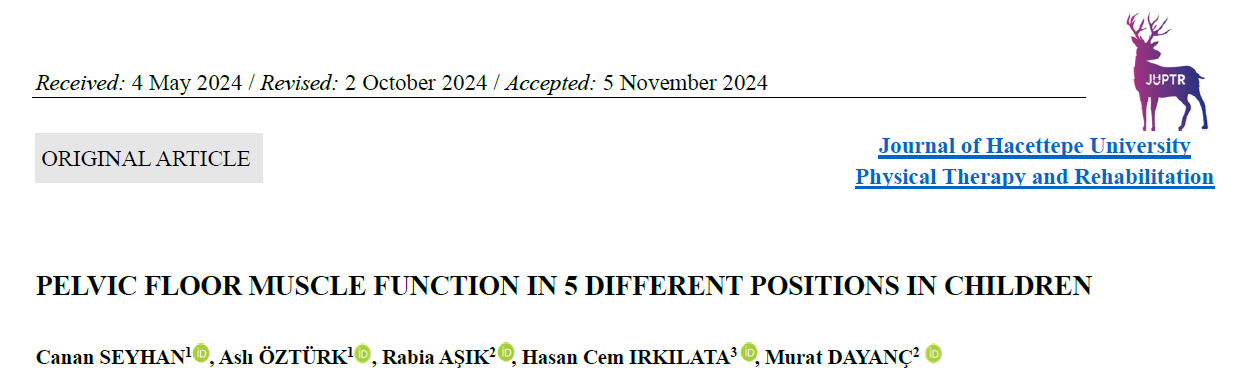 Original ArticlePublished on October 30 2024PELVIC FLOOR MUSCLE FUNCTION IN 5 DIFFERENT POSITIONS IN CHILDREN Canan Seyhan, Aslı Öztürk, Rabia Aşık, Hasan Cem Irkılata, Murat Dayanç