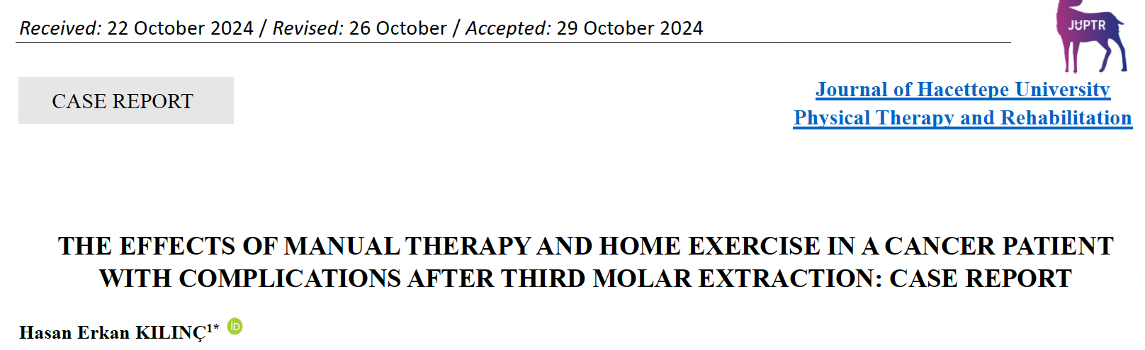 Case ReportPublished on October 30 2024THE EFFECTS OF MANUAL THERAPY AND HOME EXERCISE IN A CANCER PATIENT WITH COMPLICATIONS AFTER THIRD MOLAR EXTRACTION: CASE REPORT Hasan Erkan Kılınç