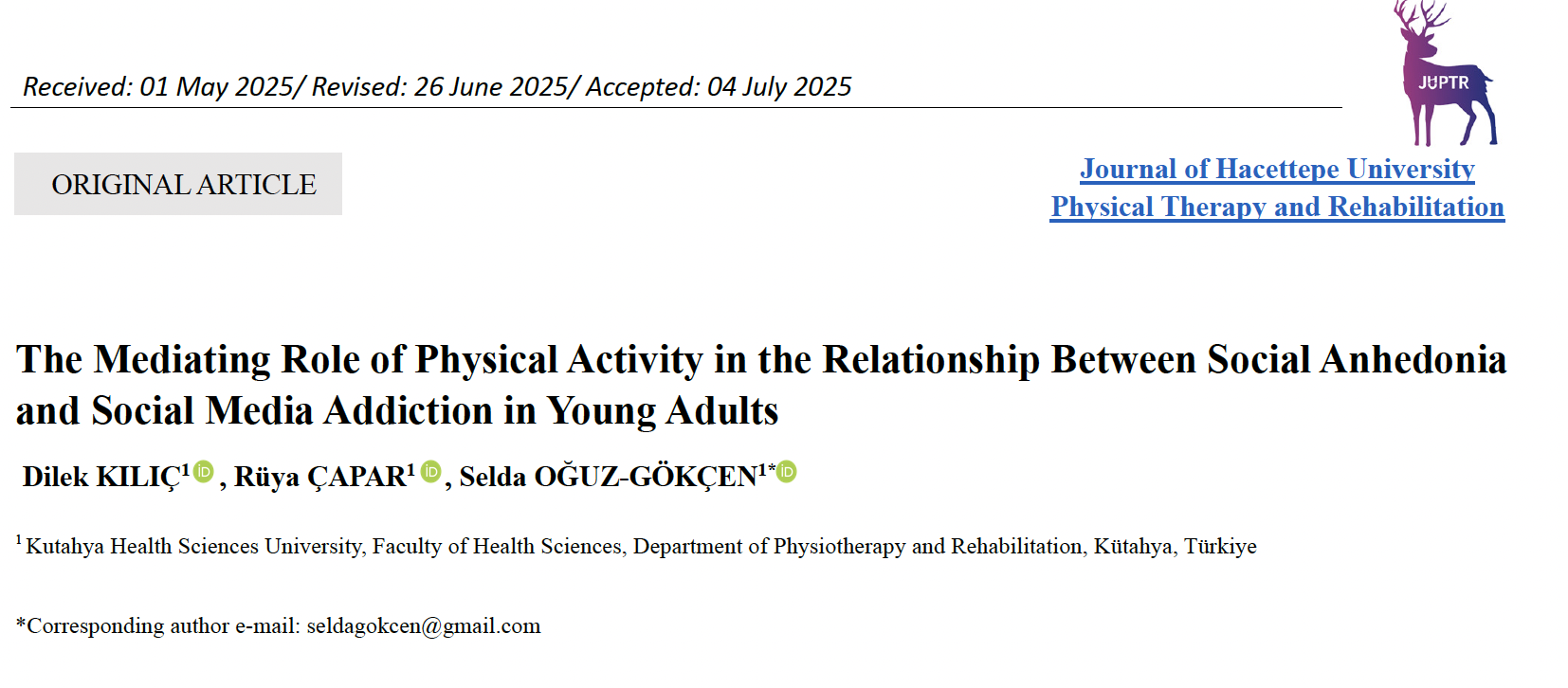 Original ArticlePublished on September 05 2025The Mediating Role of Physical Activity in the Relationship Between Social Anhedonia and Social Media Addiction in Young Adults Dilek Kılıç, Rüya Çapar, Selda Oğuz Gökçen