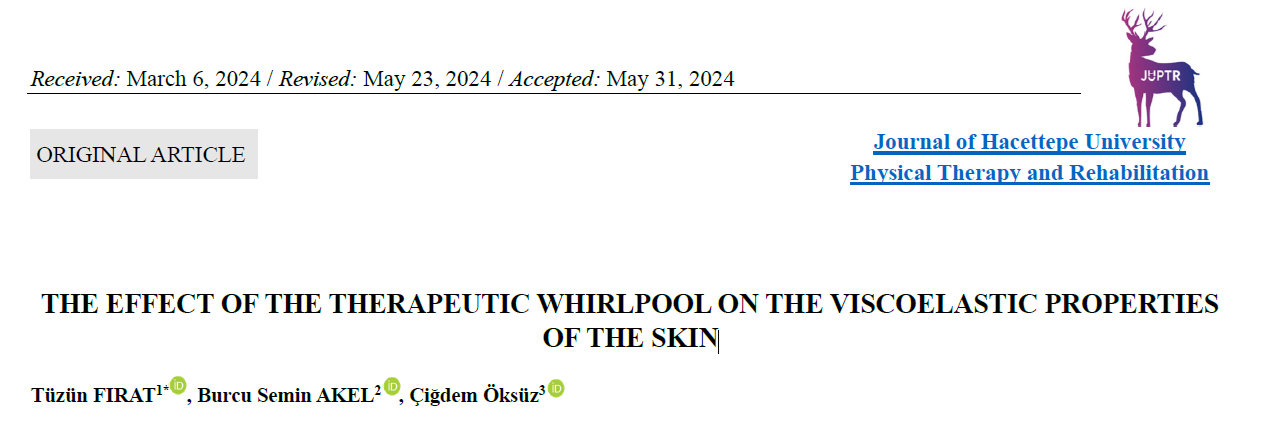 Original ArticlePublished on June 24 2024THE EFFECT OF THE THERAPEUTIC WHIRLPOOL ON THE VISCOELASTIC PROPERTIES OF THE SKIN Tüzün Fırat, Burcu Semin Akel, Çiğdem Öksüz