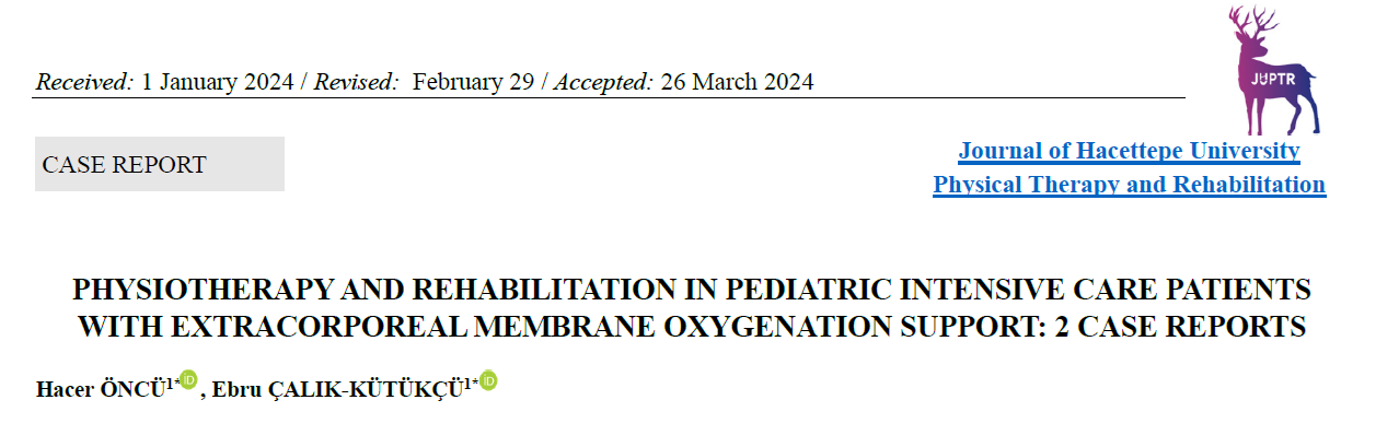 Case StudyPublished on June 24 2024PHYSIOTHERAPY AND REHABILITATION IN PEDIATRIC INTENSIVE CARE PATIENTS WITH EXTRACORPOREAL MEMBRANE OXYGENATION SUPPORT: 2 CASE REPORTS Hacer Öncü, Ebru Çalık Kütükçü