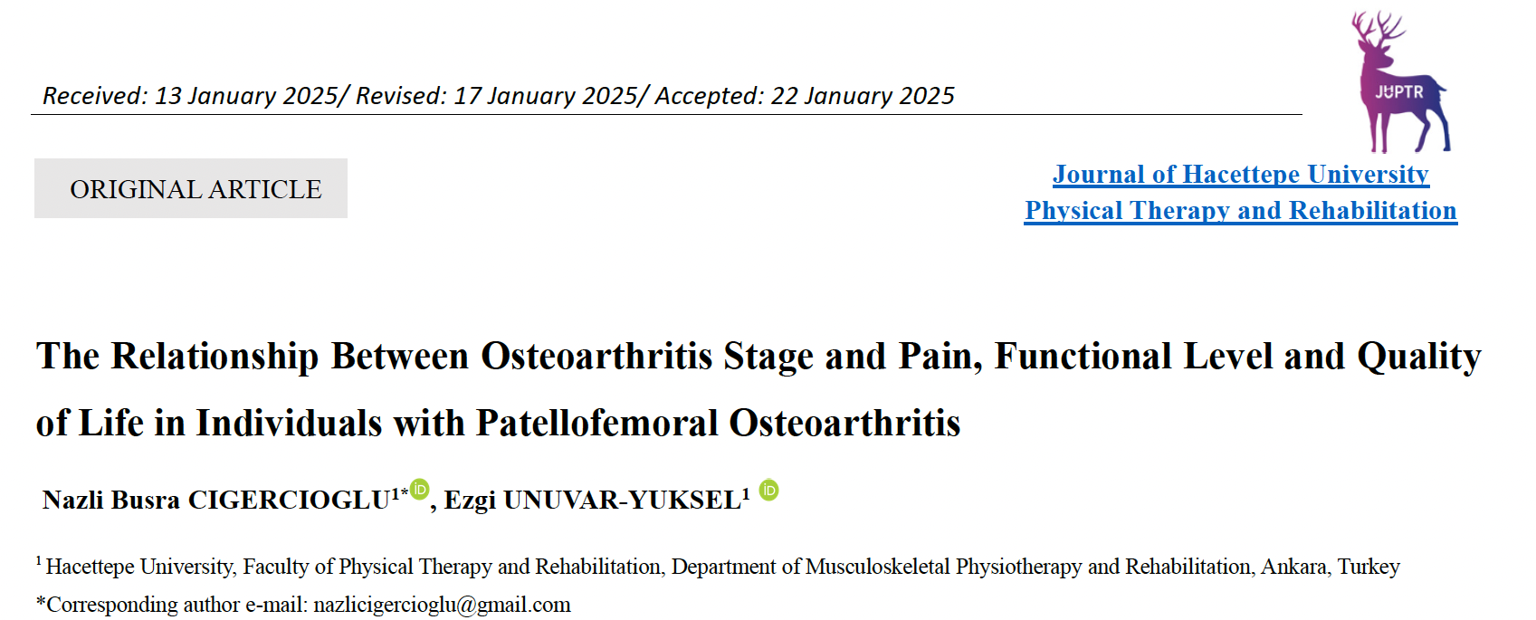 Original ArticlePublished on February 04 2025The Relationship Between Osteoarthritis Stage and Pain, Functional Level and Quality of Life in Individuals with Patellofemoral Osteoarthritis Nazlı Büşra Ciğercioğlu, Ezgi Ünüvar Yüksel