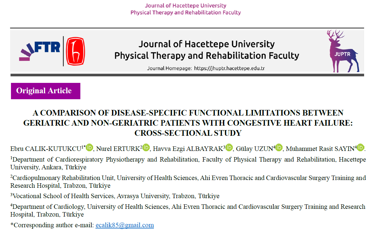 Original ArticlePublished on November 27 2023A COMPARISON OF DISEASE-SPECIFIC FUNCTIONAL LIMITATIONS BETWEEN GERIATRIC AND NON-GERIATRIC PATIENTS WITH CONGESTIVE HEART FAILURE: CROSS-SECTIONAL STUDY Ebru Çalık Kütükçü, Nurel Ertürk, Havva Ezgi Albayrak, Gülay Uzun, Muhammet Raşit Sayın