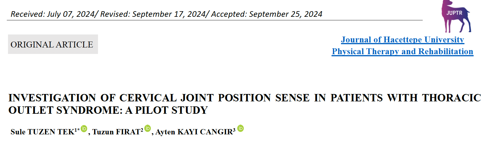 Original ArticlePublished on October 30 2024INVESTIGATION OF CERVICAL JOINT POSITION SENSE IN PATIENTS WITH THORACIC OUTLET SYNDROME: A PILOT STUDY Şule Tuzen Tek, Tüzün Fırat, Ayten Kayı Cangır