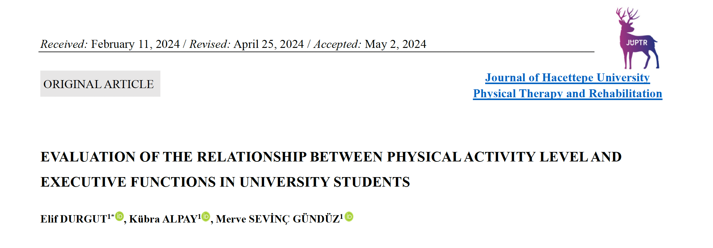 Original ArticlePublished on October 30 2024EVALUATION OF THE RELATIONSHIP BETWEEN PHYSICAL ACTIVITY LEVEL AND EXECUTIVE FUNCTIONS IN UNIVERSITY STUDENTS Elif Durgut, Kübra Alpay, Merve Sevinç Gündüz
