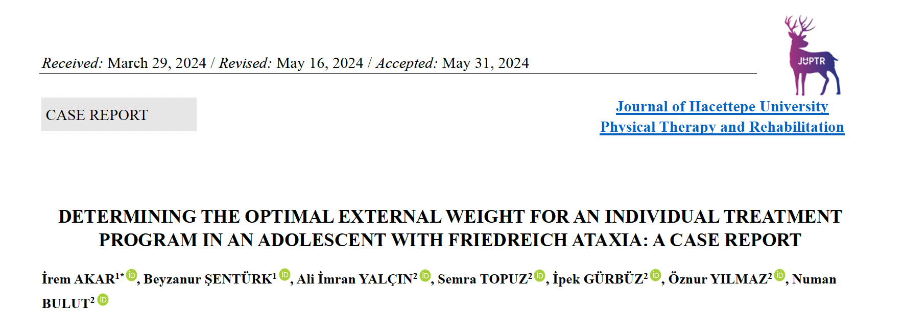 Case ReportPublished on June 24 2024DETERMINING THE OPTIMAL EXTERNAL WEIGHT FOR AN INDIVIDUAL TREATMENT PROGRAM IN AN ADOLESCENT WITH FRIEDREICH ATAXIA: A CASE REPORT İrem Akar, Beyzanur Şentürk, Ali İmran Yalçın, Semra Topuz, İpek Gürbüz, Öznur Yılmaz, Numan Bulut