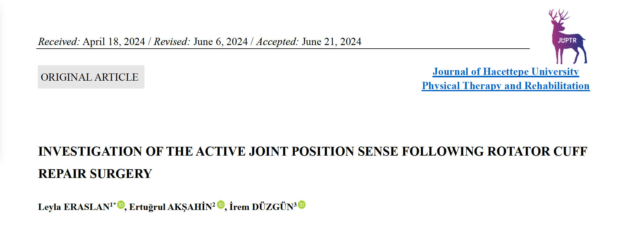 Original ArticlePublished on October 30 2024INVESTIGATION OF THE ACTIVE JOINT POSITION SENSE FOLLOWING ROTATOR CUFF REPAIR SURGERY Leyla Eraslan, Ertuğrul Akşahin, İrem Düzgün