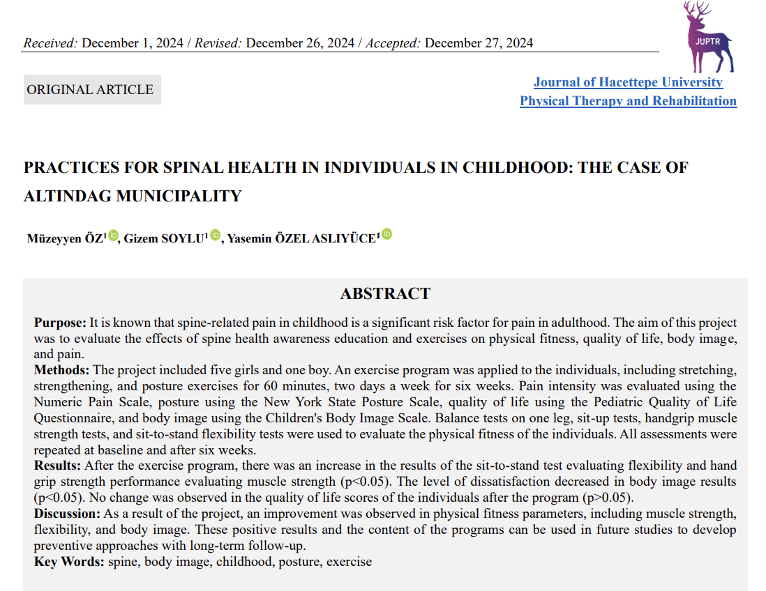 Original ArticlePublished on January 02 2025PRACTICES FOR SPINAL HEALTH IN INDIVIDUALS IN CHILDHOOD: THE CASE OF ALTINDAG MUNICIPALITY Müzeyyen Öz, Gizem Soylu, Yasemin Özel Aslıyüce