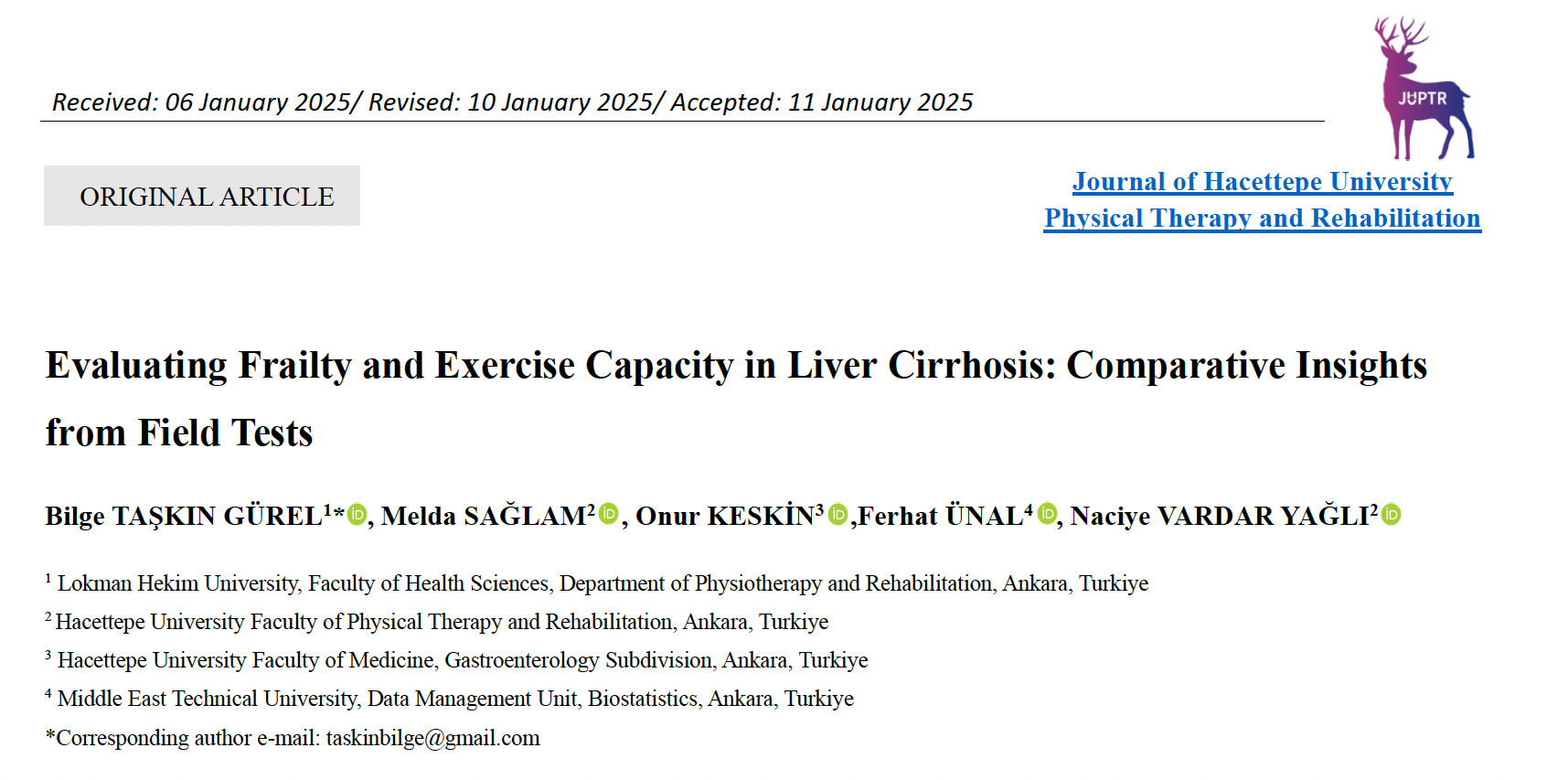 Original ArticlePublished on February 04 2025Evaluating Frailty and Exercise Capacity in Liver Cirrhosis: Comparative Insights from Field Tests Bilge Taşkın Gürel, Melda Sağlam, Onur Keskin, Ferhat Ünal, Naciye Vardar Yağlı